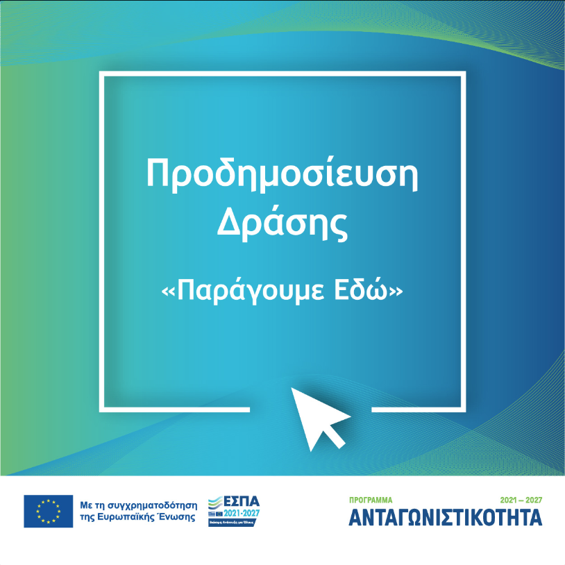 Το Επιμελητήριο Πέλλας ενημερώνει τα μέλη του ότι προδημοσιεύτηκε η νέα Δράση «Παράγουμε Εδώ», συνολικού προϋπολογισμού 50 εκατομμυρίων ευρώ, η οποία θα χρηματοδοτηθεί από το Πρόγραμμα “Ανταγωνιστικότητα” του ΕΣΠΑ 2021–2027. Η Δράση στοχεύει στη στήριξη της εγχώριας παραγωγής, την ενίσχυση των εξαγωγών και τη βελτίωση της διεθνούς ανταγωνιστικότητας των ελληνικών μικρομεσαίων επιχειρήσεων. Ιδιαίτερη έμφαση δίνεται σε κλάδους όπου εντοπίζεται έλλειμμα εγχώριας παραγωγής σε σχέση με […]